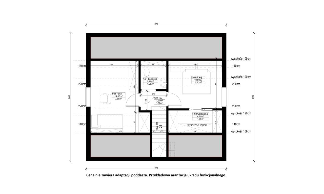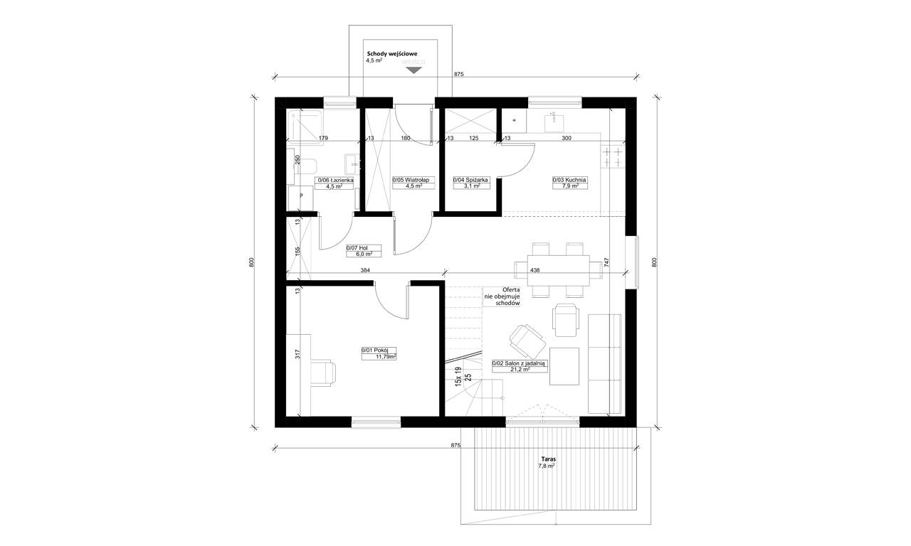 Es besteht die Möglichkeit, die Speisekammer als technischen Raum mit einem Eingang von der Seite des Vorraums zu nutzen - alle unsere Gebäude haben in der Wand von der Seite des Vorraums einen vorbereiteten Platz für die Montage der Tür, die nach der Entfernung der Paneele, die den Durchgang schließen, eingesetzt werden kann.
