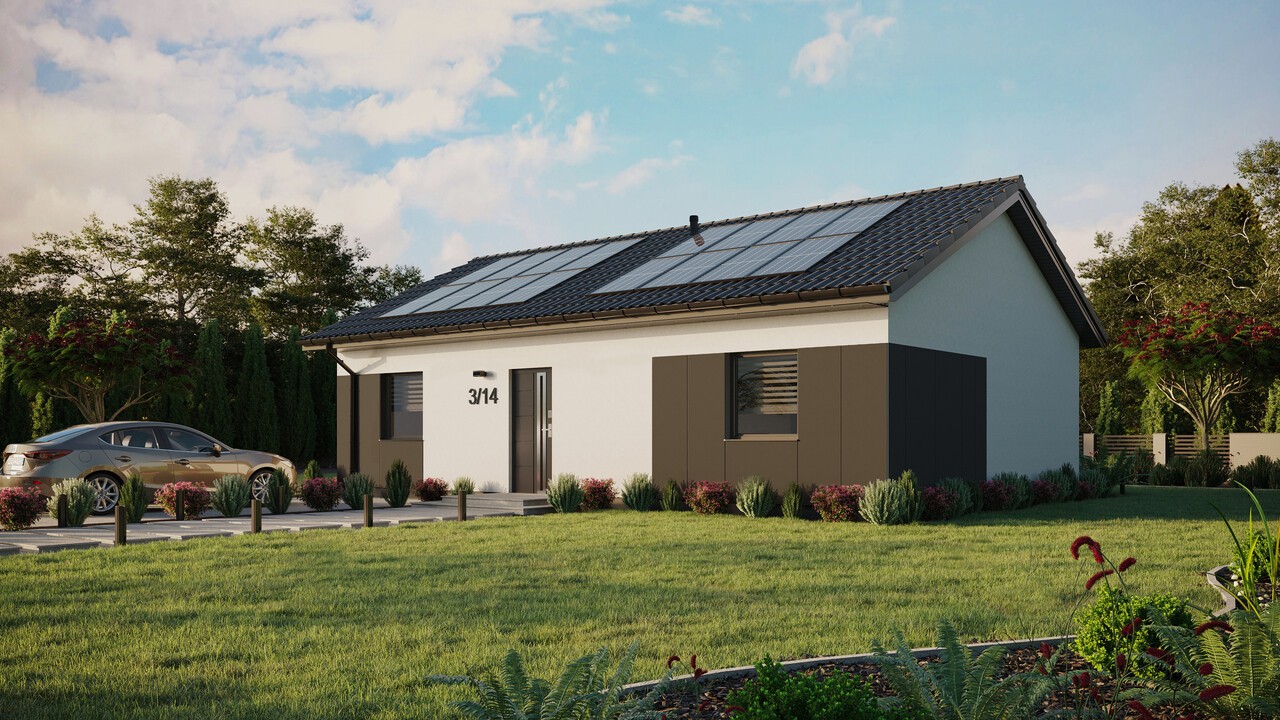 ERDOL 2 XL in der gewählten Konfiguration hat ein Satteldach ohne nutzbares Dachgeschoss mit einer Neigung von 25 Grad und ist mit EUROCOLOR SYNEGO PVC-Tischlerarbeiten auf einem 80 mm breiten Profil der Marke REHAU in den Farben Anthrazit ausgestattet.