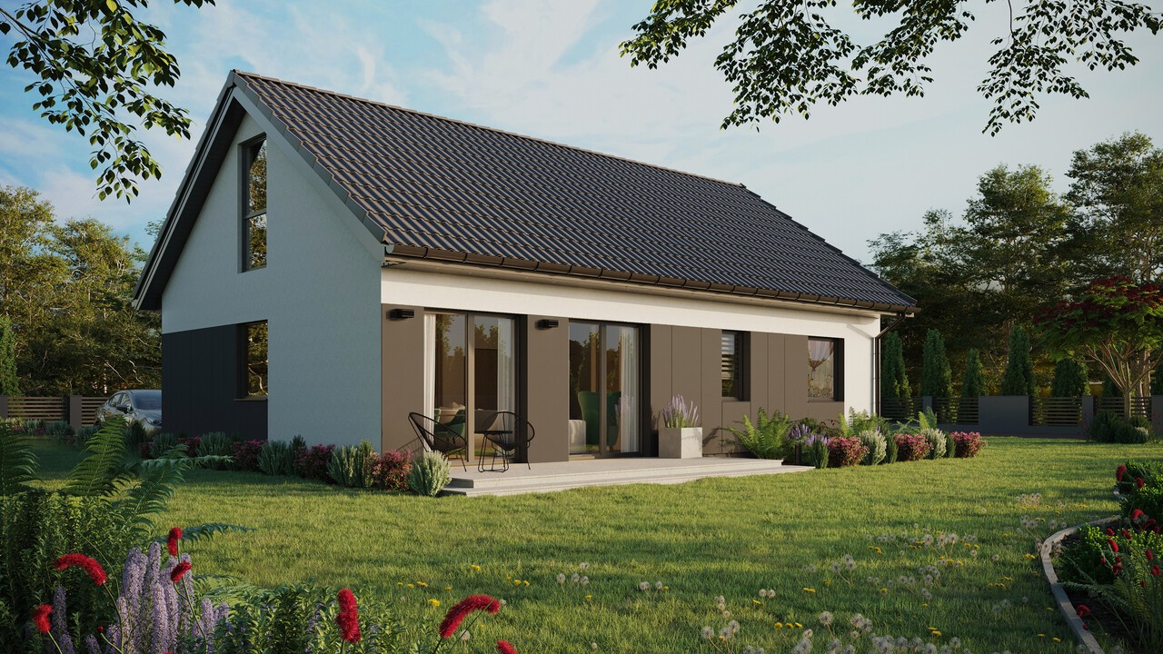 ERDOL 2 XL in der gewählten Konfiguration hat ein Satteldach mit nutzbarem Dachgeschoss mit einer Neigungswinkel 35 Grad und ist mit EUROCOLOR SYNEGO PVC-Tischlerarbeiten auf einem 80 mm breiten Profil der Marke REHAU in den Farben Anthrazit ausgestattet.