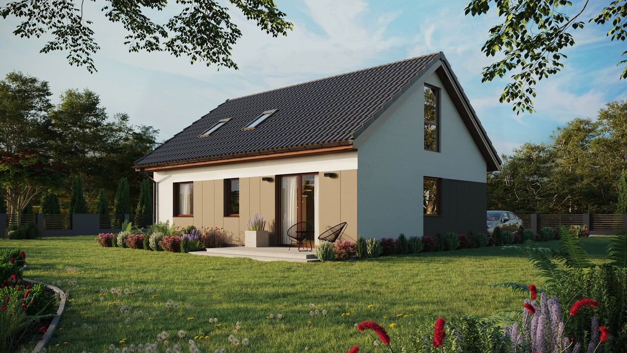 Das Haus ERDOL 2 mit einer Fläche von 68 m² (107 m² in der Version mit nutzbarem Dachgeschoss) wurde entworfen, um auf kompaktem Raum Komfort und alles zu bieten, was im täglichen Leben am wichtigsten ist. Modernste Technologien und ökologische Lösungen machen es zu einem energieeffizienten Haus, das im Einklang mit der Natur funktioniert. Für die Konstruktion wird KVH-Holz verwendet, das die Grundlage der gesamten Struktur bildet. Entsprechend ausgewählte Dämmstoffe sorgen dafür, dass das Haus vor Wärmeverlusten geschützt ist.