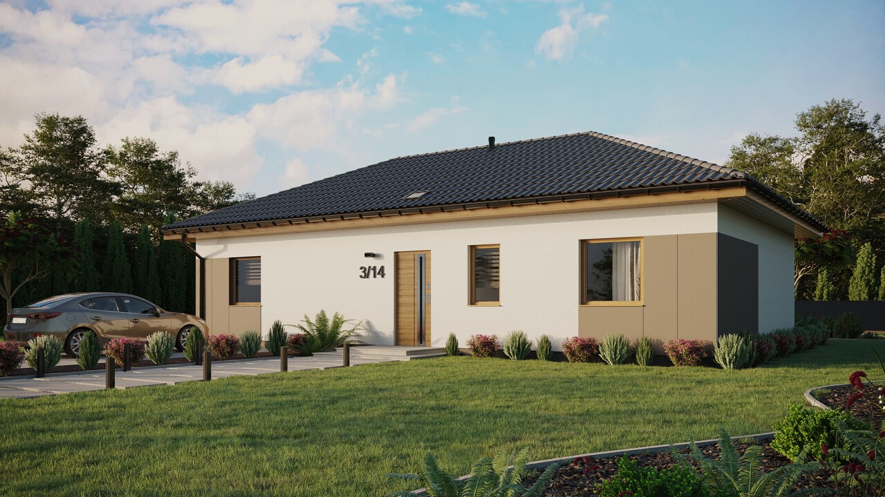 ERDOL 3 XL in der gewählten Konfiguration hat ein Walmdach ohne nutzbares Dachgeschoss mit einer Neigung von 25 Grad und ist mit EUROCOLOR SYNEGO PVC-Tischlerarbeiten auf einem 80 mm breiten Profil der Marke REHAU in den Farben Winchester ausgestattet.