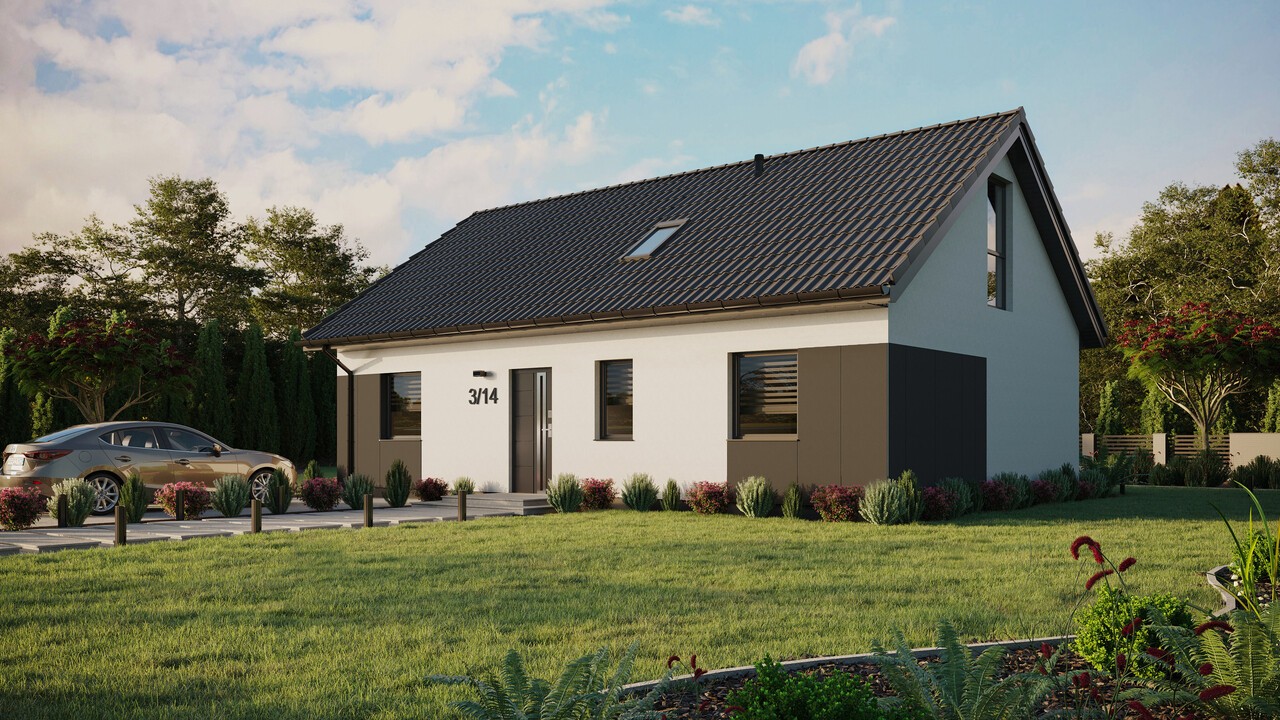 ERDOL 3 in der gewählten Konfiguration hat ein Satteldach mit nutzbarem Dachgeschoss mit einer Neigungswinkel 35 Grad und ist mit EUROCOLOR SYNEGO PVC-Tischlerarbeiten auf einem 80 mm breiten Profil der Marke REHAU in den Farben Anthrazit ausgestattet.