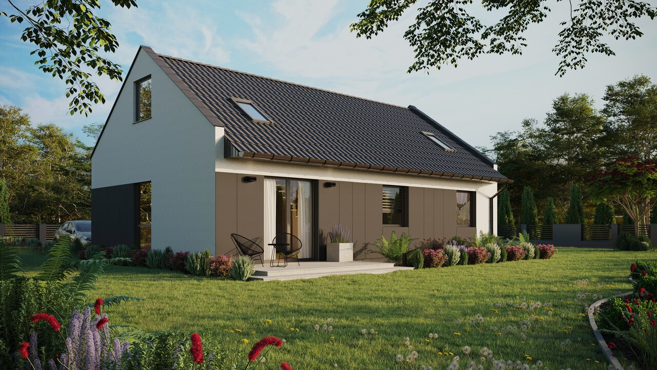 ERDOL 3 in der gewählten Konfiguration hat ein Modernes Steildach mit nutzbarem Dachboden mit einem Neigungswinkel von 35 Grad und ist mit EUROCOLOR SYNEGO PVC-Tischlerarbeiten auf einem 80 mm breiten Profil der Marke REHAU in den Farben Anthrazit ausgestattet.