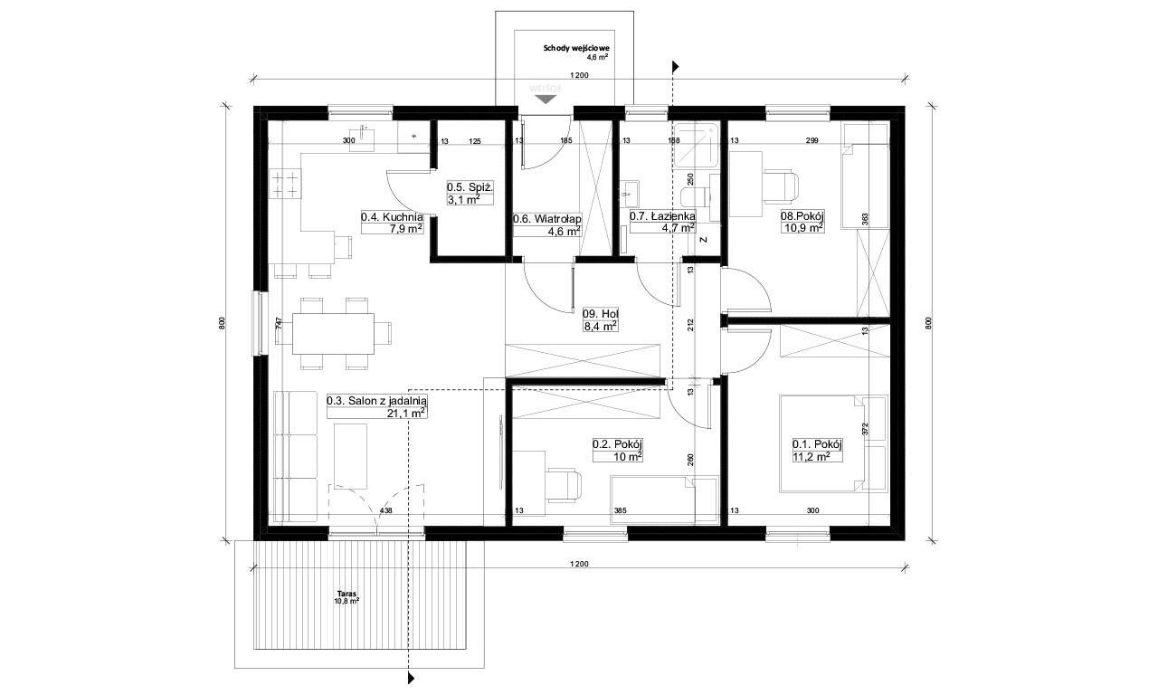 Es besteht die Möglichkeit, die Speisekammer als technischen Raum mit einem Eingang von der Seite des Vorraums zu nutzen - alle unsere Gebäude haben in der Wand von der Seite des Vorraums einen vorbereiteten Platz für die Montage der Tür, die nach der Entfernung der Paneele, die den Durchgang schließen, eingesetzt werden kann.